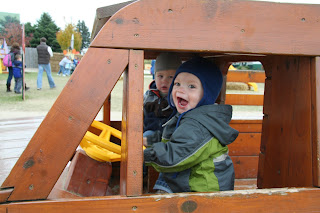 So I'm a little behind on blogging again, but I promise I haven't abondoned you. This past Sunday we went to McHenry to a pumpkin patch with the Lyons family. I had a lot of hopes that this would be an awesome time full of fun and excitement and that Jack would love ever minute of it. I'm not sure why I momentarily forgot reality, but I did. So it was fun, but it wasn't all I hoped it would be. I underdressed Jack for the ride to the patch, for some reason I didn't consider the wind or clouds. So Jack was very cold and because of that didn't want to leave Paul's arms. After we got pumpkins and ate lunch we had grand plans to let the kids play. The farm had a small petting zoo, some inflatable bounce houses and slides, ponies to ride and stuff like that. The first thing we did was let them play in the corn boxes. Which apparantly they loved and didn't really need anything else. When we took Jack out of the corn he flipped and had a complete melt down. So we took him far away to look at tractors. He was interested but cried every time we tried to get him to sit on one. I guess he was more interested in admiring from a distance. Finally we got him on the barrell ride and he did love that but hated that he had to wait in line to go on it a second time. He kept trying to chase it down. Thankfully there was some country music being played over speakers and that was enough to distract Jack and get him dancing. So it was a good time and it was fun to spend time with friends and get to do stuff with Paul too, but we did have our moments. I learned that pushing naptime results in a super crabby Jack and I learned that I need to have more realistic expectations. Both of these things I have learned before but for some reason forgot this particular weekend. Below is a slideshow of our adventures.