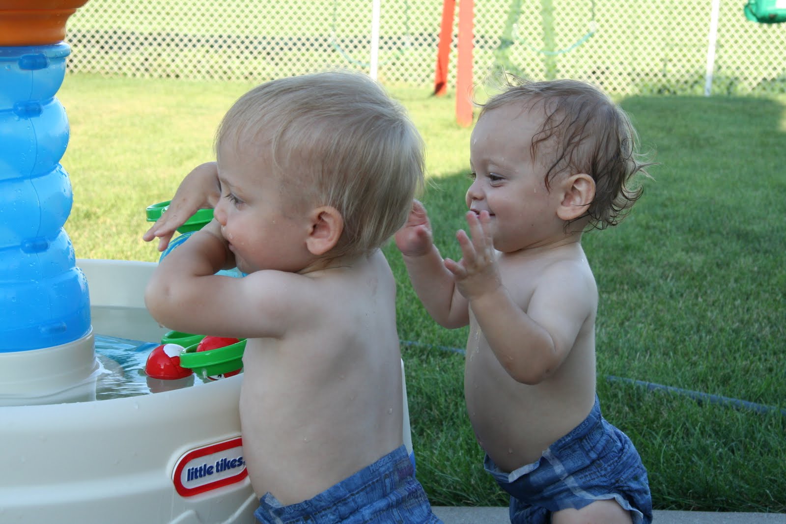 This is my proof. Logan can stand. He just doesn't realize it. This happened just this week during one of our many evenings spent outside getting wet. Water is really the only option if we're going to be outside in all the heat.